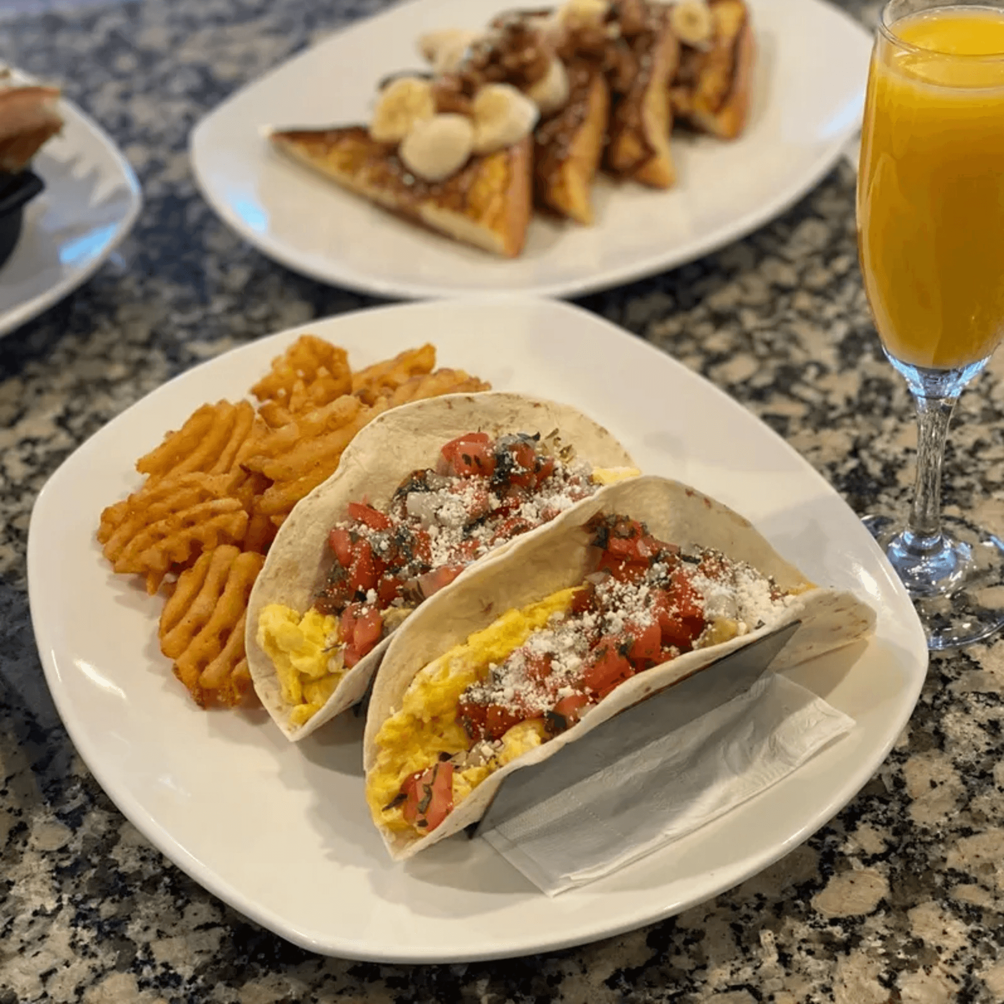 Toasted chocolate muffin, squires smoothie & soft taco breakfast (with waffle fries) = 15/10 🤤🤤🤤 Really lovely and perfect breakfast spot. Food and drinks were great. Thank you!!